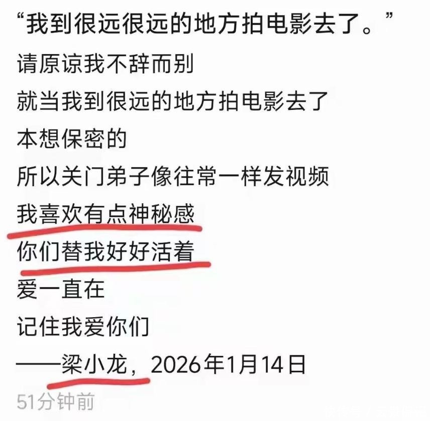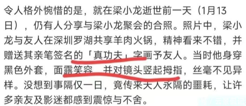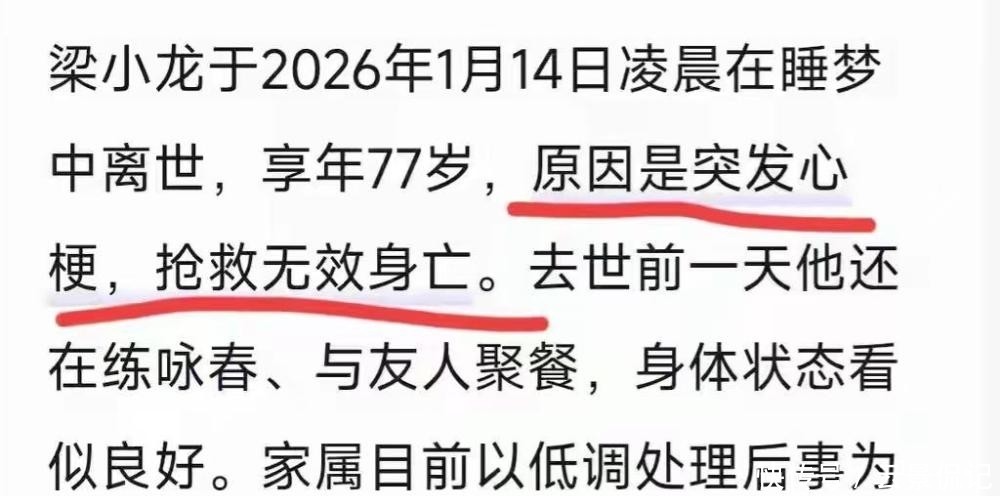 1月14日凌晨,梁小龙在睡梦中突发心梗走了。前一天晚上,他还在深圳罗湖和朋友吃羊肉火锅,精神头看着挺好。谁能想到,一天时间不到,人就没了。