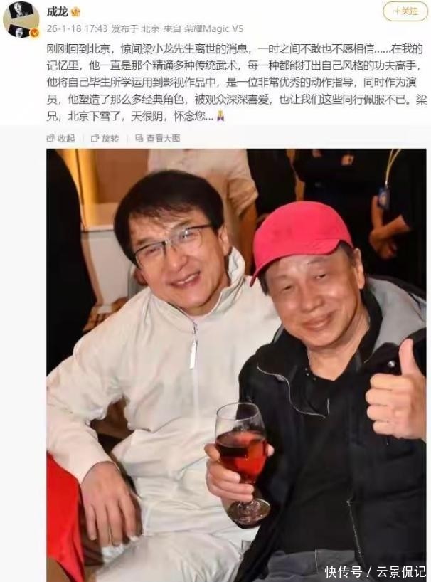 成龙、周星驰这些同行看到消息都发文悼念,成龙说“梁兄一直是精通武术的高手,塑造的经典角色让我们同行都佩服”,周星驰就晒了张旧照,写着“永远怀念梁小龙先生”,简单几个字满是不舍。
